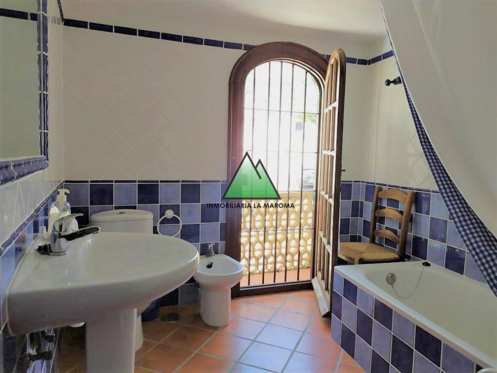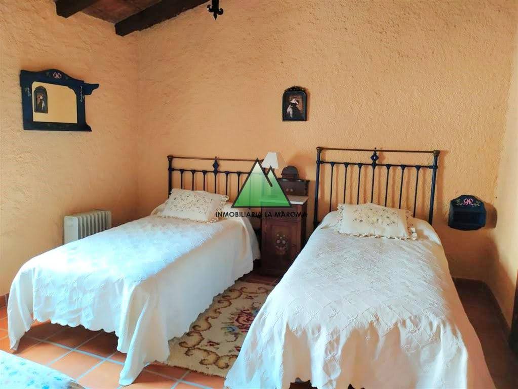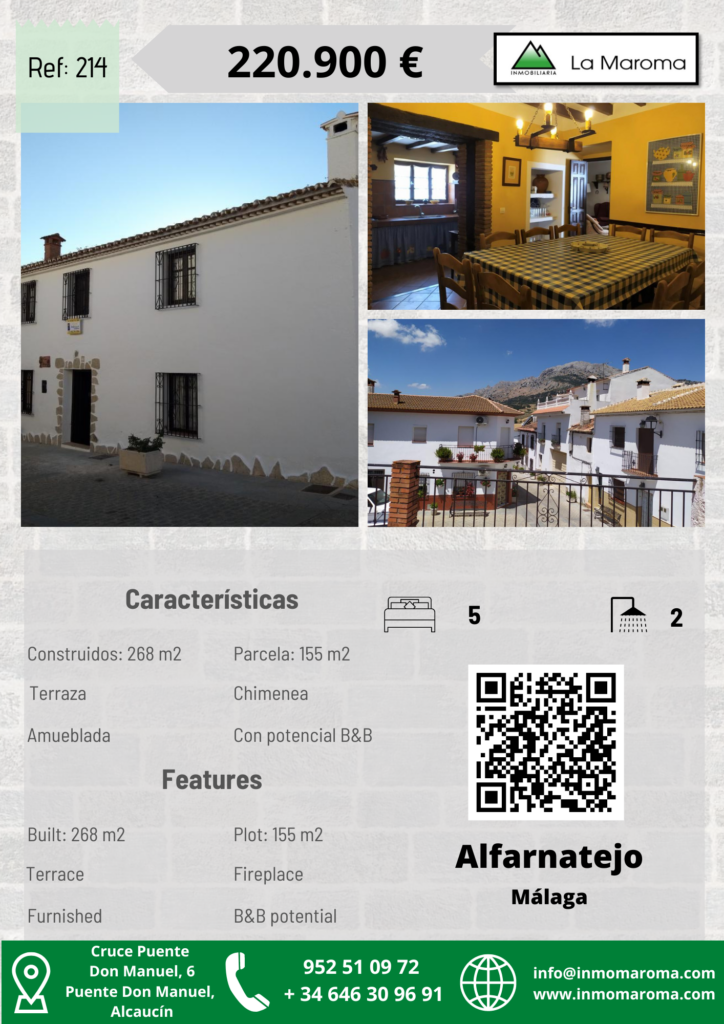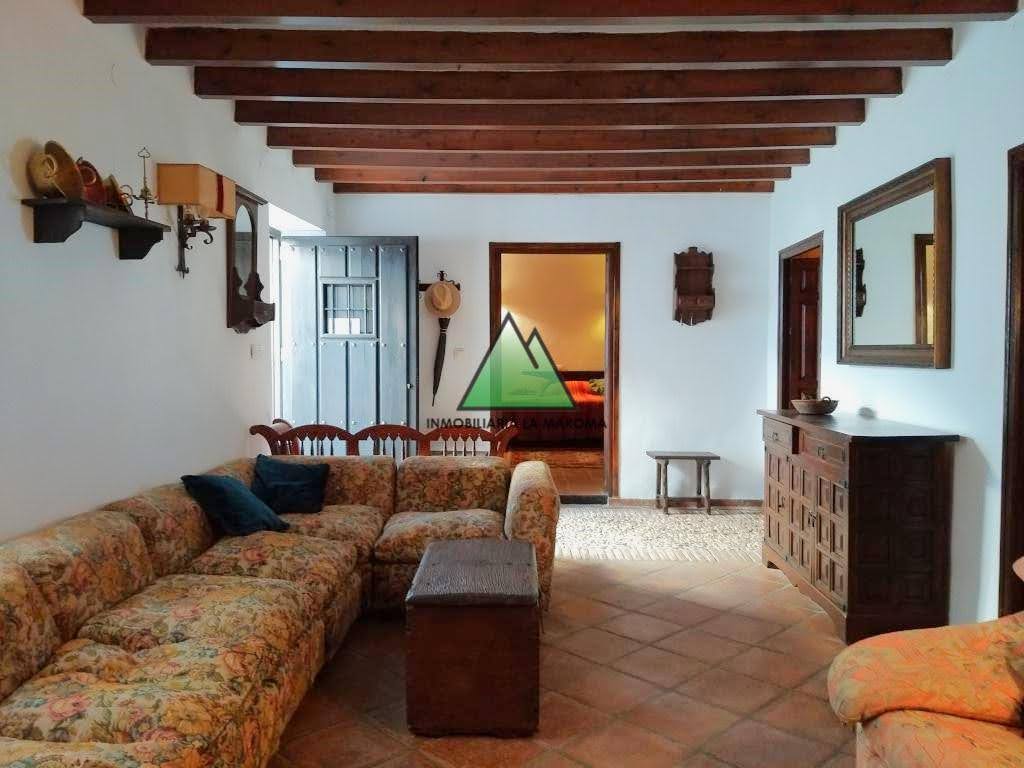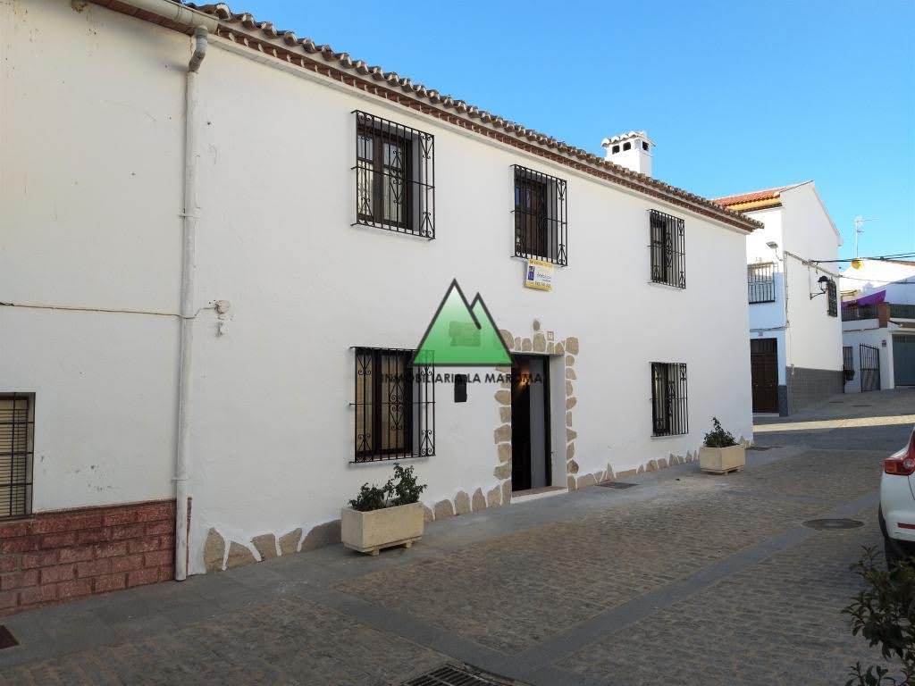 Preciosa casa rústica situada en el centro del pueblo de Alfarnatejo, distribuida en dos plantas, en la primera planta se encuentra el salón con chimenea, a la izquierda se encuentra un dormitorio y a la derecho el comedor el cual lleva a la cocina la cual esta totalmente amueblada, continuando en la primera planta nos encontramos con un baño (con ducha), un dormitorio doble. En la segunda planta se encuentran los 4 dormitorios restantes que son dobles y poseen armarios empotrados de madera, uno de ellos tiene una terraza con unas vistas preciosas y por ultimo, en la segunda planta se encuentra el baño pero este con bañera. En la parte trasera de la casa se encuentra un patio techado y el trastero.