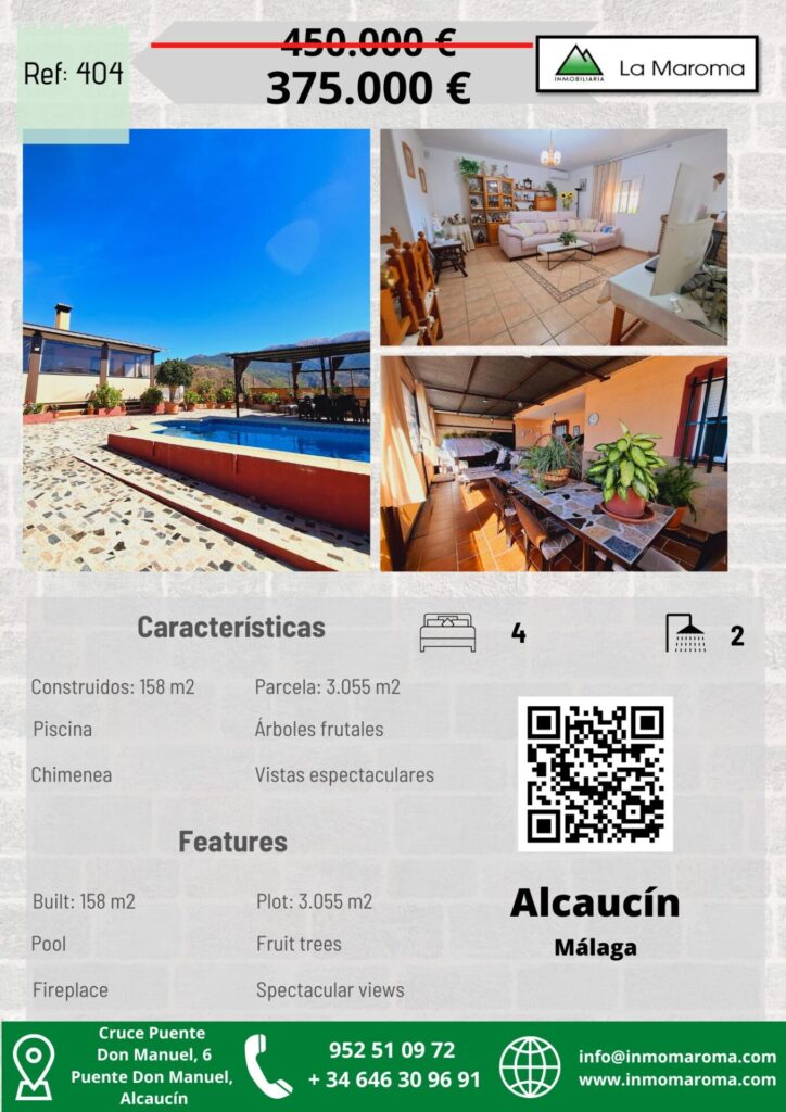 La propiedad de 158 m2 construidos se distribuye en su interior en un salón comedor con chimenea, cocina recientemente renovada, un baño completo y 3 dormitorios. En el exterior, un amplio y precioso porche cubierto permite disfrutar de las preciosas vistas a la montaña, así como a la zona de la piscina, solárium y cocina de verano. Además, la propiedad también cuenta con un amplio y espacioso garaje, con chimenea, que actualmente sirve como taller de costura y como salón de reuniones familiares.